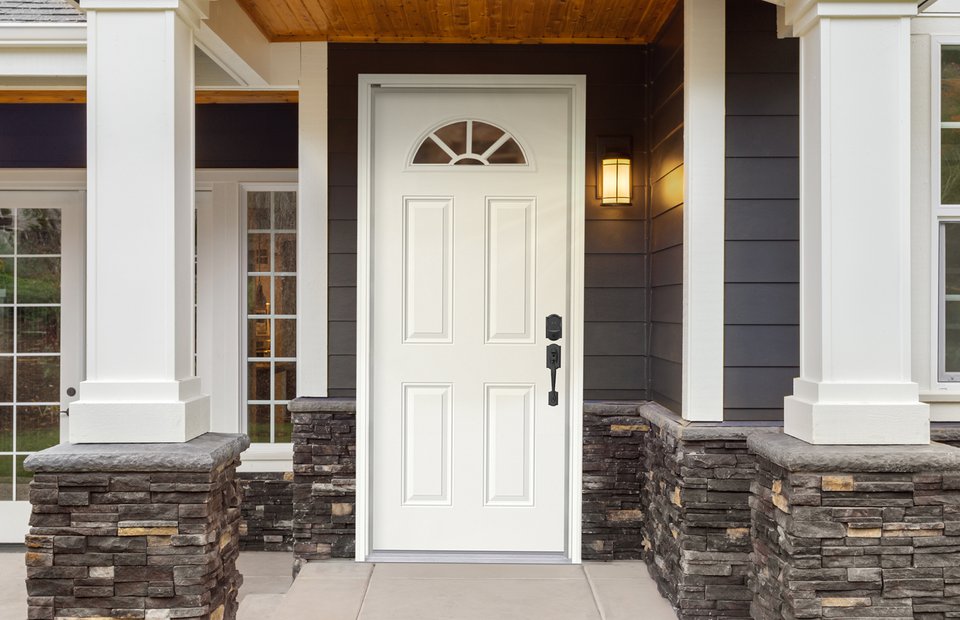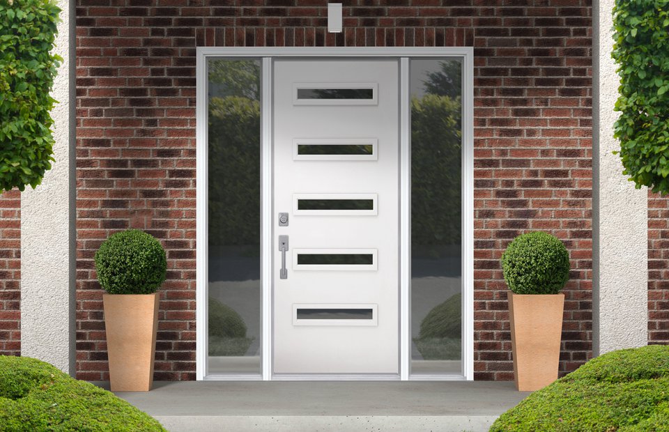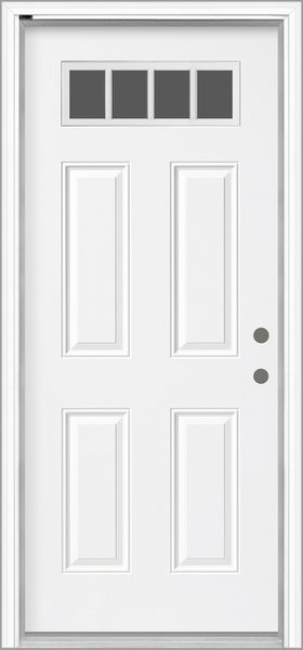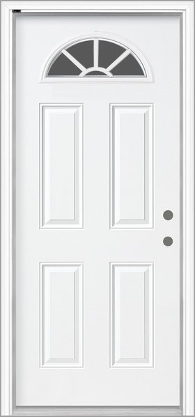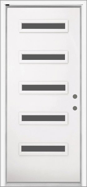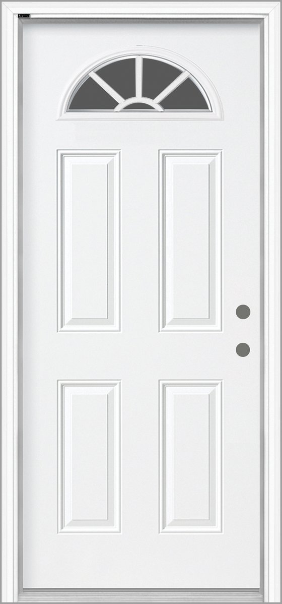The sunburst has long been a popular choice among homeowners. Featuring external white grilles in a five-lite 22” x 10” sunburst design, it allows soft natural light to filter through while maintaining maximum privacy. Available exclusively with a steel door.