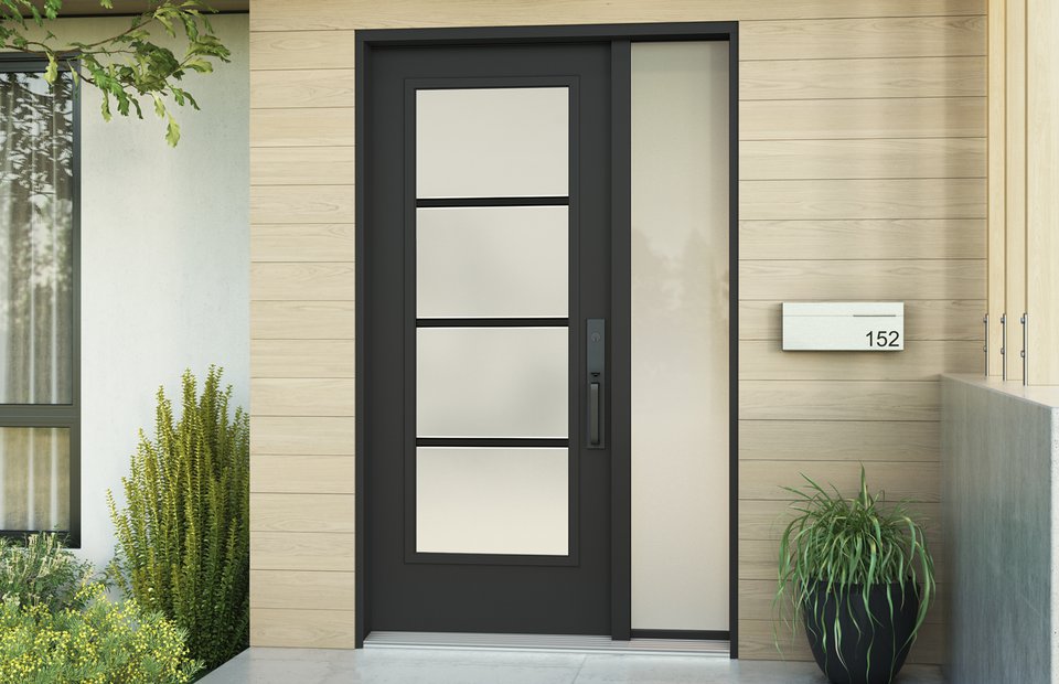 A One Lite door system is perfect for every entryway in your home. Pure doorglass is a modern design that pairs perfectly with black exterior windows featuring horizontal mullions. Sleek lines on silkscreened glass balance privacy with a clear view to the outdoors, ideal for today's modern clean lined architectural details on new builds or renovations.